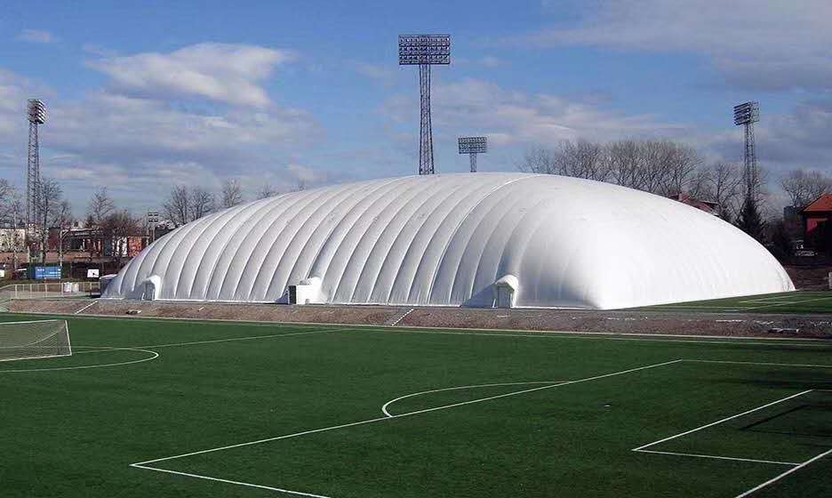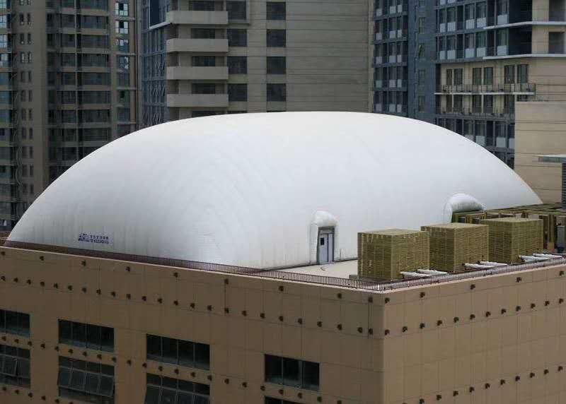 充气膜结构有单层、双层、气肋式三种形式! 气承式结构直接用单层薄膜作为屋面和外墙,将周边锚固在圈梁或地梁上。气囊中的气压为室外气压的2~7倍,故是一种高压体系。气承式膜结构(索膜结构)是通过压力控制系统向建筑物内充气,使室内外保持一定的压力差,使覆盖膜体受到上浮力,并产生一定的预张应力,以保证体系的刚度。室内设置空压自动调节系统,来及时地调整室内外气压,以适应外部荷载的变化。由于跨中不需要任何支撑,因此适用于超大跨度的建筑,一般用于大型体育馆。膜建筑屋面重量仅为常规钢屋面的1/30,降低了墙体和基础的造价。同时膜建筑奇特的造型和夜景效果有明显的"建筑可识性"和商业效应,其价格效益比更高。 膜工程中所有加工和制作依设计均可在工厂内完成,在现场只进行安装作业。相比传统建筑的施工周期,要快数倍。一般情况下工期为2-3个月,抢工期的情况下40天也可完工。膜材有较高的反射性及较低的光吸收低,并且热传导性较低,这极大程度上阻止太阳能进入室内。另外,膜材的半透明性保证了适当的自然漫散射光照明室内。 自重轻,膜建筑可以不需要内部支撑面大跨度覆盖空间。