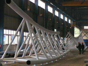 5、梯形管桁架:和三角形桁架相比,杆件受力情况有所改善,而且用于屋架中可以更容易满足某些工业厂房的工艺要求.铺板机如果梯形桁架的上、下弦平行就是平行弦桁架,杆件受力情况较梯形略差,但腹杆类型大为减少,多用于桥梁和栈桥中.