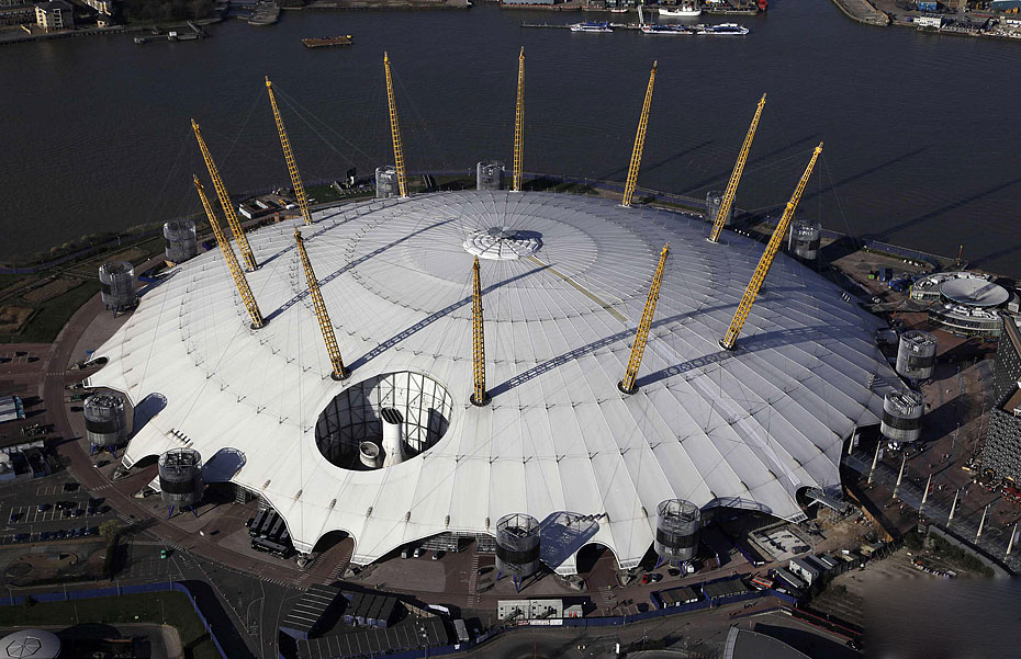 英国伦敦的千年穹顶位于伦敦东部泰晤士河畔的格林威治半岛上,英国政府为迎接21世纪而兴建的标志性建筑。是世界各国为了迎接新千年的到来而兴建的一系列千禧建筑中最为着名的作品,这个工程原先只考虑建成临时性的,后经研究,这项工程不论是从周围市区的复兴,或是建筑交通基础设施的长期投资来说都具有很大价值,许多人称它是20世纪90年代产生的鸿篇巨作。是英国旅游协会评出的2000年度英国最受欢迎的收费观光景点,入选全球10年十大建筑。整个建筑为穹庐形,穹庐直径320m,周长大于1000m,有12根穿出屋面高达100m的桅杆,屋盖采用圆球形的张力膜结构。屋盖材料表面积达10万平方米,采用仅为1毫米厚的膜状材料--涂聚四氟乙烯的玻璃纤维织物敷设。据说坚韧无比,可承受波音747飞机的重量。