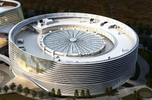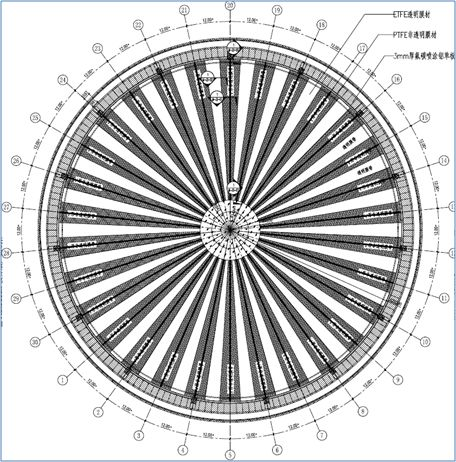 本工程为悬空的索系支撑结构体系。膜结构覆盖范围约3500平米,结构总高约10米,结构距离地面25.8米,造型为60个单元辐射型排布组成的圆形索网膜结构,采用PTFE膜材与ETFE膜材交错相间覆盖。