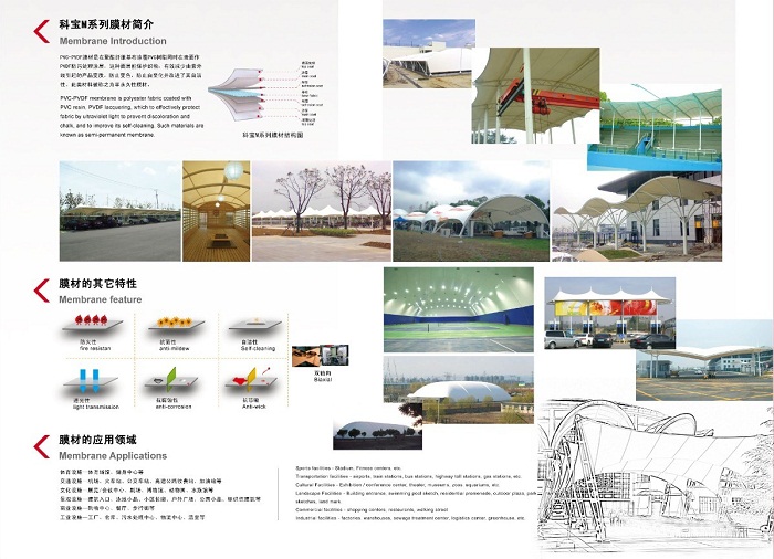 3、PVC、PVDF膜材料特点说明:PVC膜材料的织物基材应为聚酯类、聚酰胺类的纤维织物。涂层主要为聚氯乙烯类(PVC)树脂,依据功能要求不同涂层的重量应在400~1500g/m2之间,面层宜选用聚偏氟乙烯树脂(PVF)、聚二氟乙烯树脂(PVDF)、聚丙烯树脂(ACRYLIC)、硅树脂等,且应具有改进PVC膜材料的自洁性及抗老化性能的功能。PVC膜材料的厚度应大于0.5mm。面层在保质期内应具有稳定的抗腐蚀、抗紫外线的侵蚀能力,具有自洁性能。