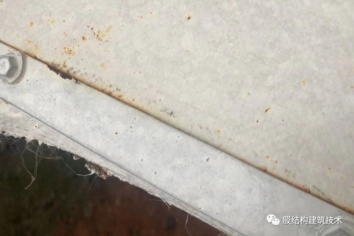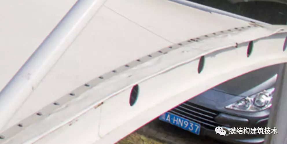 正确做法:膜材应该用铝合金压条压住,压条宽度不得低于40mm,厚度不得低于4mm,螺栓必须是304不锈钢螺栓。