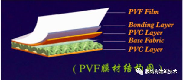 PVF膜材本质上还是一种PVC膜材,只是在PVC膜材表面增加了一层PVF 涂层,一般是单面增加PVF膜材