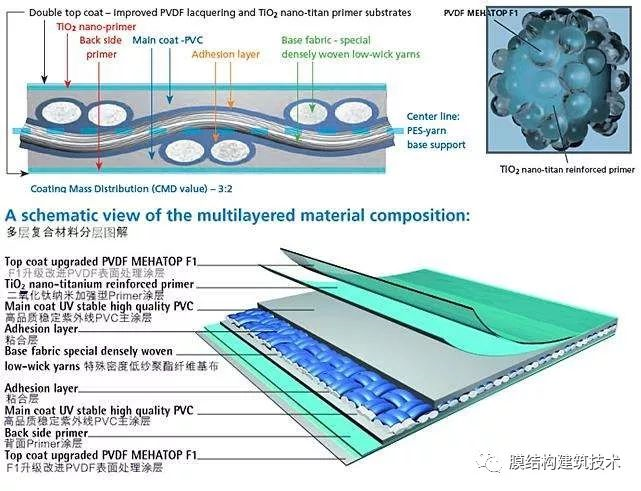 1:涂层稳定性能大大提高,大幅度提供膜材的使用年限,达到质保20年,并增加材料表面的白度和光亮度