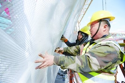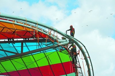 记者注意到,32个膜单元中,每一个单元都至少由三种颜色组成,比如红+橙+蓝、蓝+绿+深绿,没有一个单元是单色膜。如何在高空中拼接出完美的“两翼”?刘长宝揭秘,在工厂加工时,先根据设计图纸上的颜色排布,焊接出一个一个的多彩单元膜,然后由工人在屋面上进行现场组装,色块与色块之间的接缝都要一一对接上,“一个膜单元的安装,至少需要15个工人齐心协力方可。”