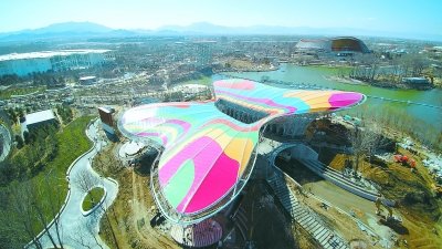 在延庆的妫水河畔,除了一柄温润的“锦绣如意”和一片“花伞花海”外,还有什么是不能错过的?那就是“花开蝶舞”的妫汭剧场了吧。采用开放式建筑形态的妫汭剧场,首次创新地采用ETFE彩色膜拼接出多彩的屋面,从而为山水间留下了一只灵动的彩蝶,以迎接八方来客。