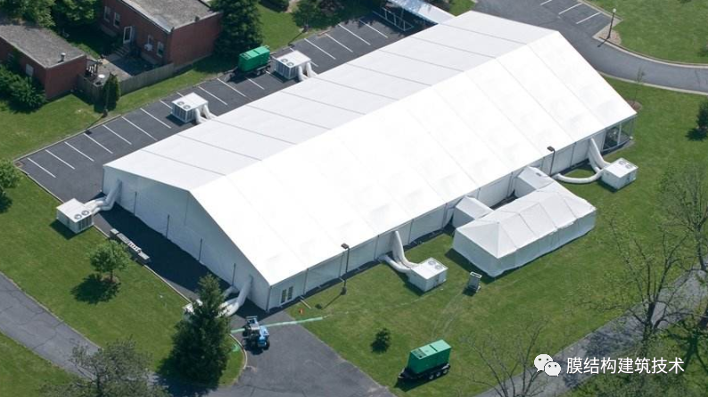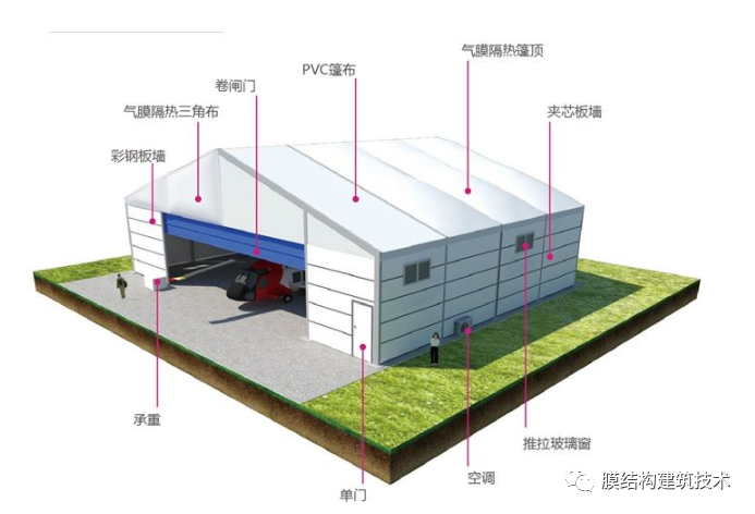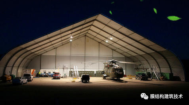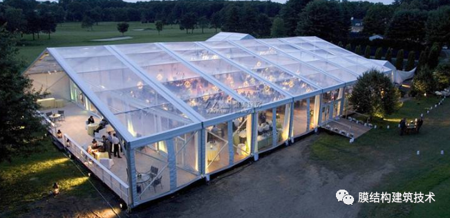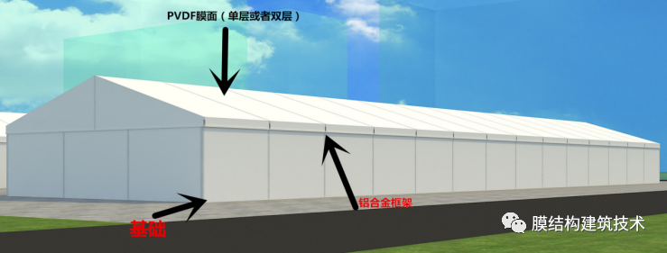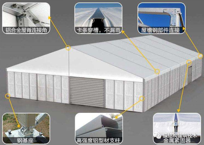 篷房主体框架为高强度中空铝合金结构或钢结构,篷房采用PVC或者PVDF膜材篷布,该篷布具有不拉伸,防雨,防紫外线的良好性能,防火级别达到国家标准B1,采用高频焊接技术,篷房抗风能力达到100-120公里/小时。支承结构篷房的结构框架一般以铝合金型材和钢材为主,铝合金框架具有美观,耐久性好,不生锈的特点在民用行业用的比较多,工业上用的篷房一般是钢框架结构。· 钢框架结构横截面采用管桁架,各杆件受力均以单向拉、压为主,通过对上下弦杆和腹杆的合理布置,可适应结构内部的弯矩和剪力分布,使材料强度得到充分发挥,从而适用于各种跨度的篷房结构。在每榀框架之间采用钢管檩条为围护结构提供必要的支撑,并增加侧向刚度。每榀桁架又分成便于组装和运输的段,然后在现场通过螺栓连接。 膜材为了达到隔热和保温的效果,采用双层膜,在双层膜之间添加纤维棉等绝缘材料,这样不但能防寒隔热,而且还能透过4%的光线,这就足以在白天不用人工采光。此外在保暖层下面还有一层很薄的蒸气绝缘层,能起吸音作用。篷房建筑用膜材的主要种类如下:PVC刀刮布(篷布)类(造价低,使用寿命5年左右)刀刮布, 以上下两面成型PVC膜为基材,在双面pvc夹层之间添加导光纤维贴,再通过热辊转动施加一定压力,将三层材料复合后冷却成型即可。其主要生产方法有刀刮涂层法、压延法、贴合法(熔融法)等。以布基分320、520、530、550这四种,其特点:优良喷绘吸墨性和较强的色彩表现力。PVC/PVDF建筑膜材PVC建筑膜材料的开发和应用得比较早,其基材为聚酯类、聚酰胺类的纤维织物。主要是PVC膜材和PVDF膜材特点:强度高,自洁,使用寿命15年以上篷房的固定篷房规模、使用时间和地面情况等条件的不同对基础的要求就有很大不同。不论是永久建筑还是临时建筑,篷房的固定有以下几种: 预埋件或膨胀螺栓固定方式对于使用时间比较长的大型篷房,需做基础预埋件,或使用膨胀螺栓固定在水泥地面或混凝土地梁中。 钢钎固定方式使用钢钎在草坪,沥青地或其他松软场地固定篷房,主要用于临时性篷房。配重物固定如果场地不允许使用钢钎或膨胀螺栓而被破坏,可以使用水泥墩、水箱和沙袋等重块来固定篷房,用于地面不允许被破坏的临时性篷房。