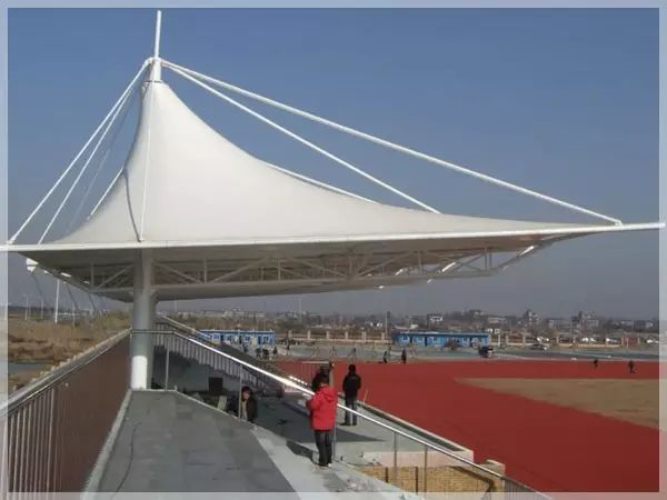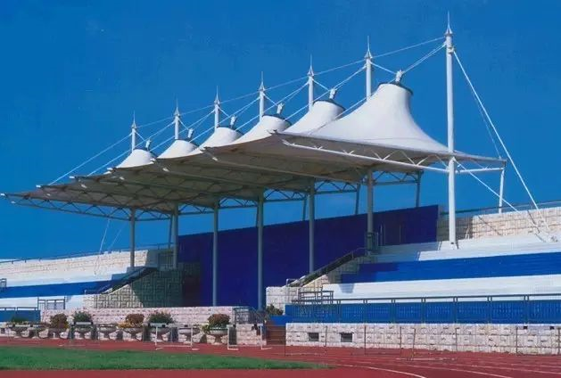 膜结构的跨度大,自重轻、抗震性好,不需要内部支撑,所以现在很多大型体育馆的球场看台都会采用膜结构建筑,膜结构相对于其他建筑体系来说工期较短,膜片的裁剪、钢索及钢结构均可在工厂加工制作,现场只需组装,减少了现场施工的时间。