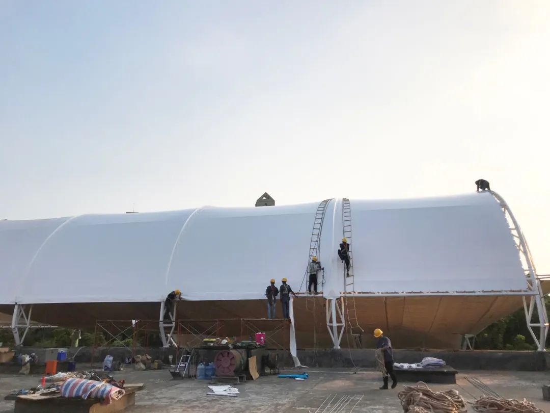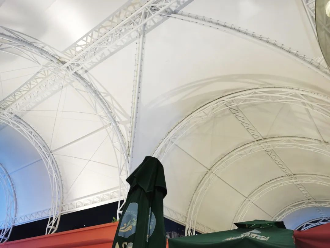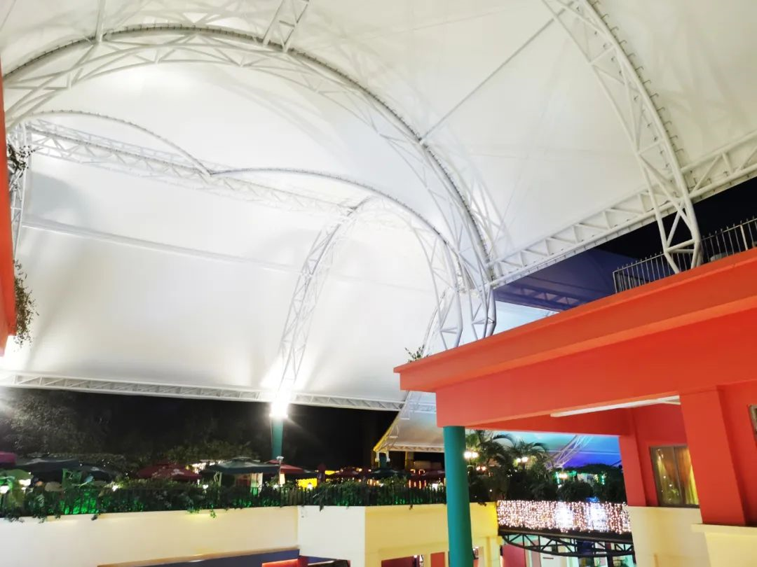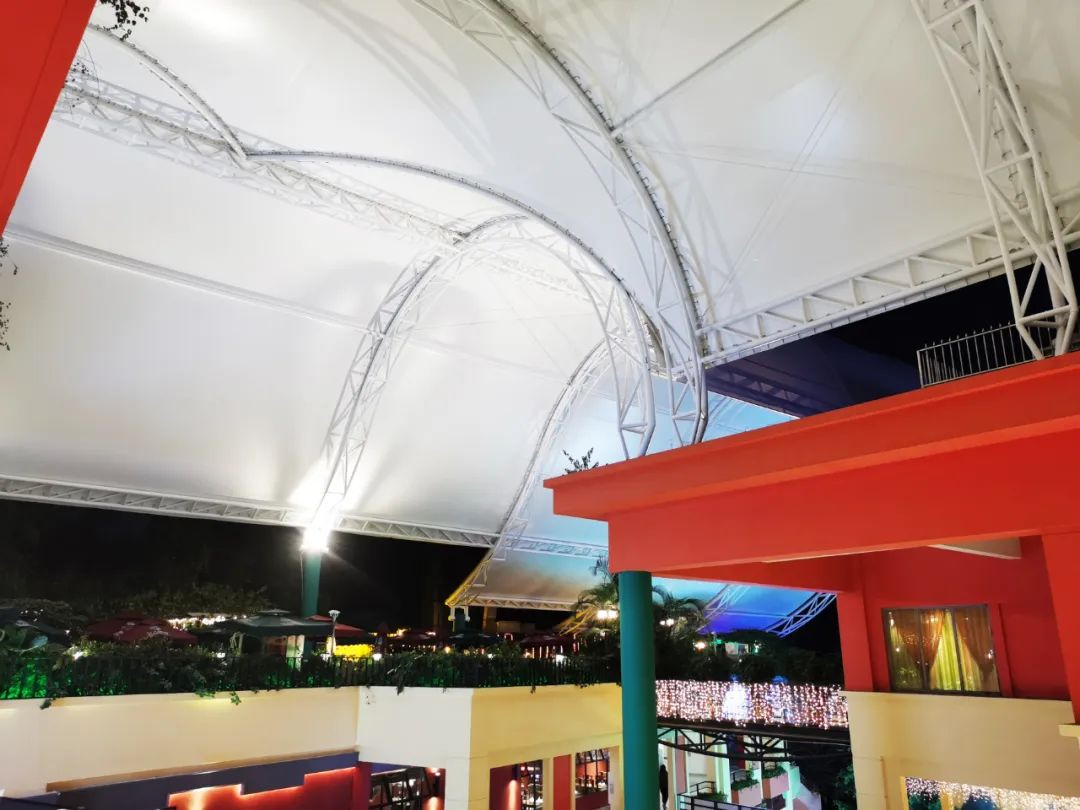 此次工程中,由于屋顶膜下面为已运营,人员密集,流动性高,施工期间需保证下面商家正常营业及人员的安全,所以难度提高,因此我司项目部就根据现场情况制定了严格的施工计划,保质保量的同时比预定工期提前完成(竣工日期为2019年的10月份),并早已投入使用。