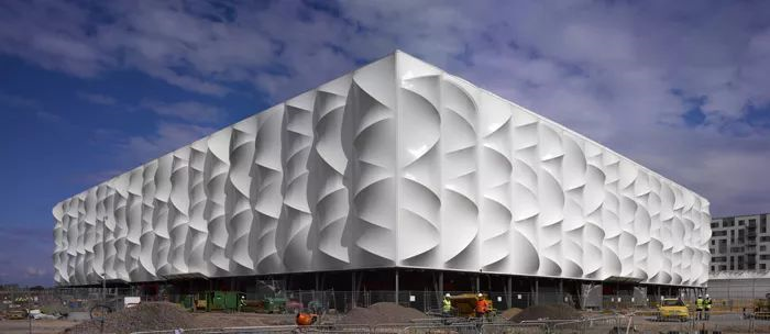 ▲ 伦敦奥运会篮球馆,可回收PVC膜在后面的结构的作用下形成优美的起伏