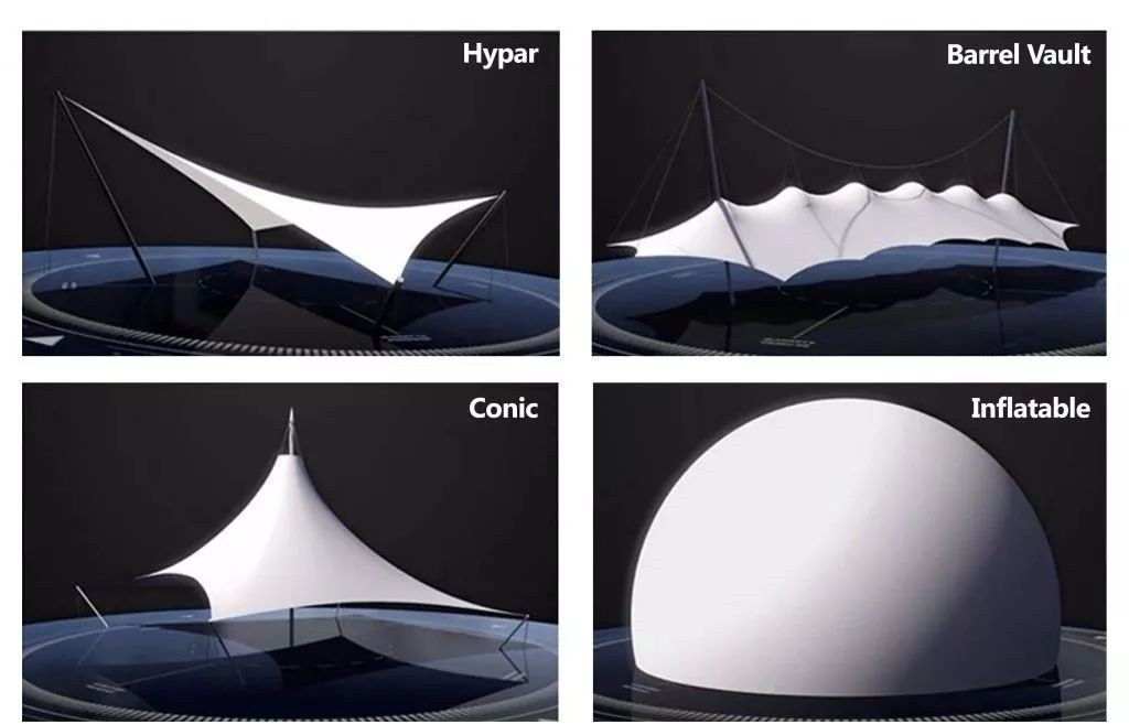张拉膜、充气膜和骨架膜三种