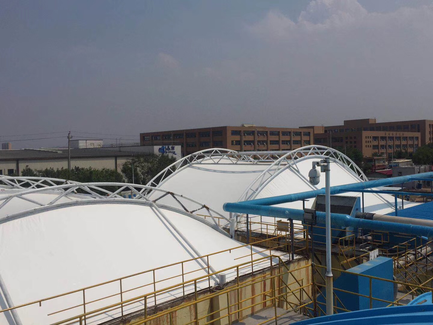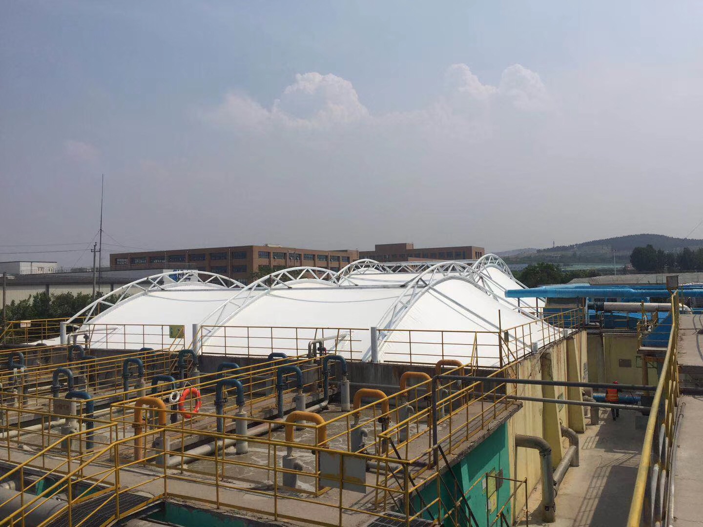 六、不挑池体。一般来说厂区的污水池都是有大有小的,小池体怎样的加盖方式均可,但跨度太大,玻璃钢、彩钢板等加盖方式便不再适用,还是得选择反吊膜。若是全部考虑反吊膜的加盖方式,综合造价更实惠。