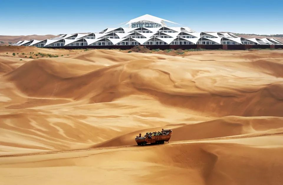 莲花酒店位于中国内蒙古库布齐沙漠的响沙湾。莲花的形式源自浩瀚沙漠中沙丘的形式,膜结构不仅是一种视觉景观,更承担着室内遮阳的作用,预估在冷却系统上能降低碳排放及电能的消耗。