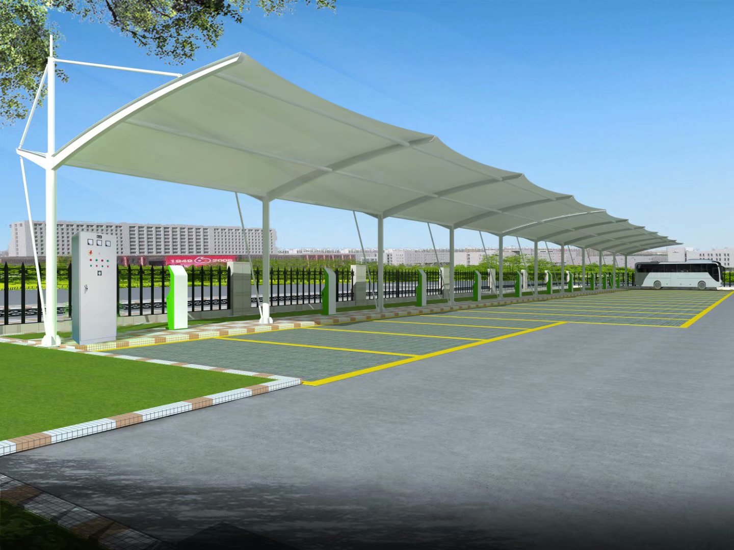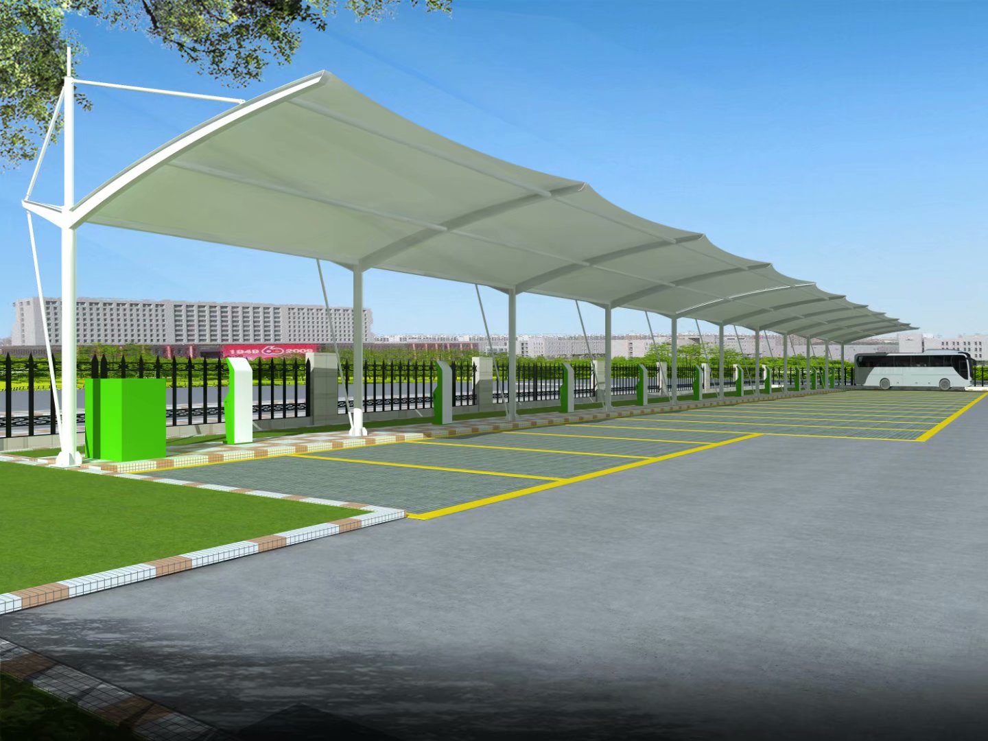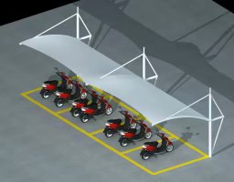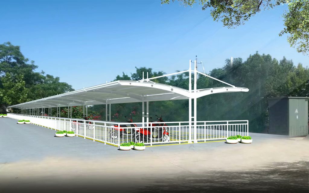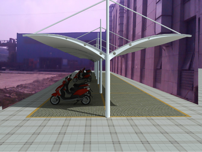 膜结构自行车、电动车棚,与汽车棚样式基本相同,不同的是尺寸,一般汽车棚前挑是6米,自行车棚是3-3.5米,自行车棚高度也会稍微低一点,尺寸需要根据客户要求定制。