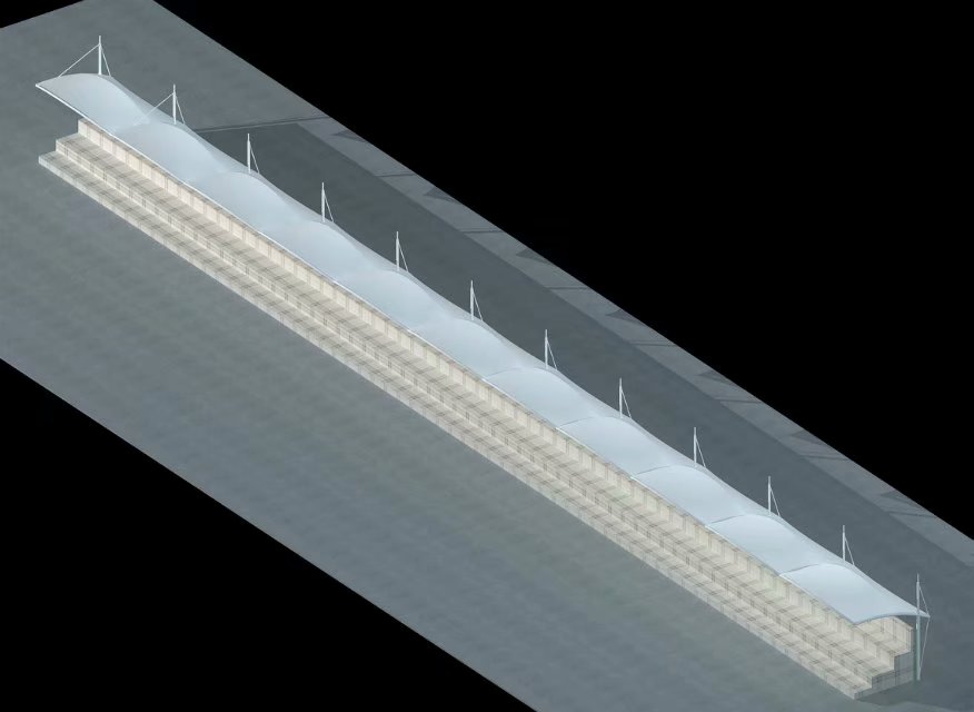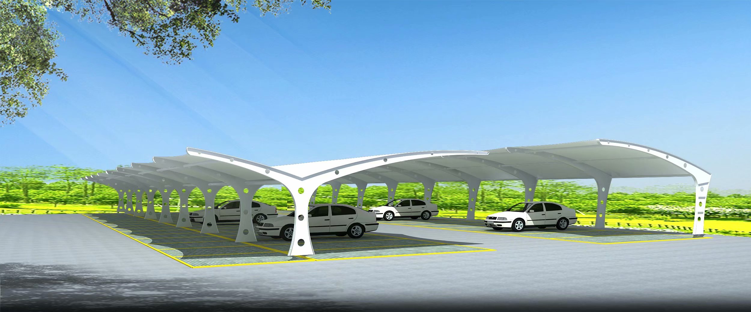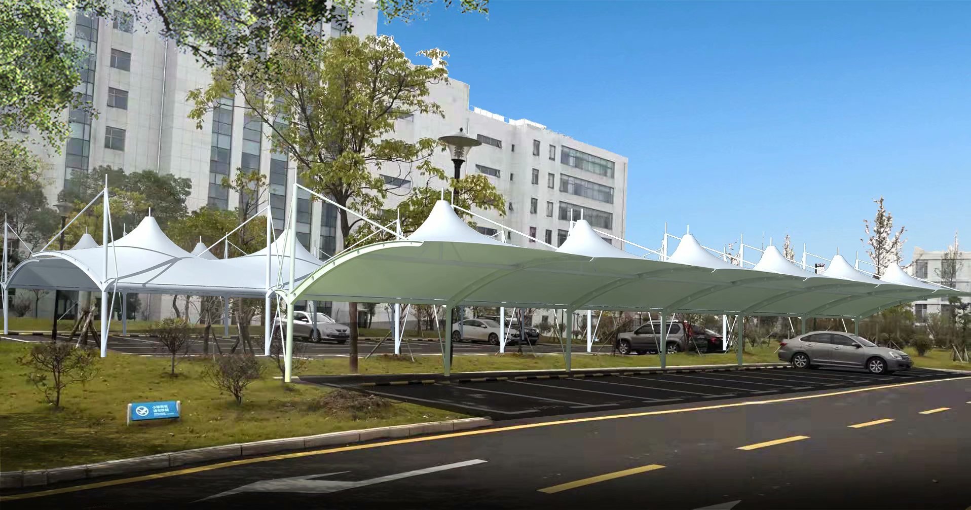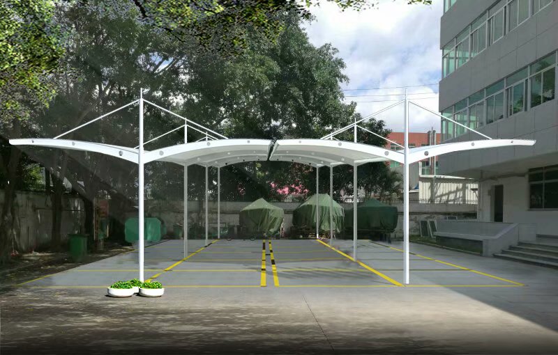 膜结构帽顶车棚,是一种具有多种优势的车棚样式,膜结构帽顶车棚因为每一间顶部有一个大帽顶,所以不会存水、存雨,造型样式也比较美观,使用寿命长,但是成本造价会稍微高一点。