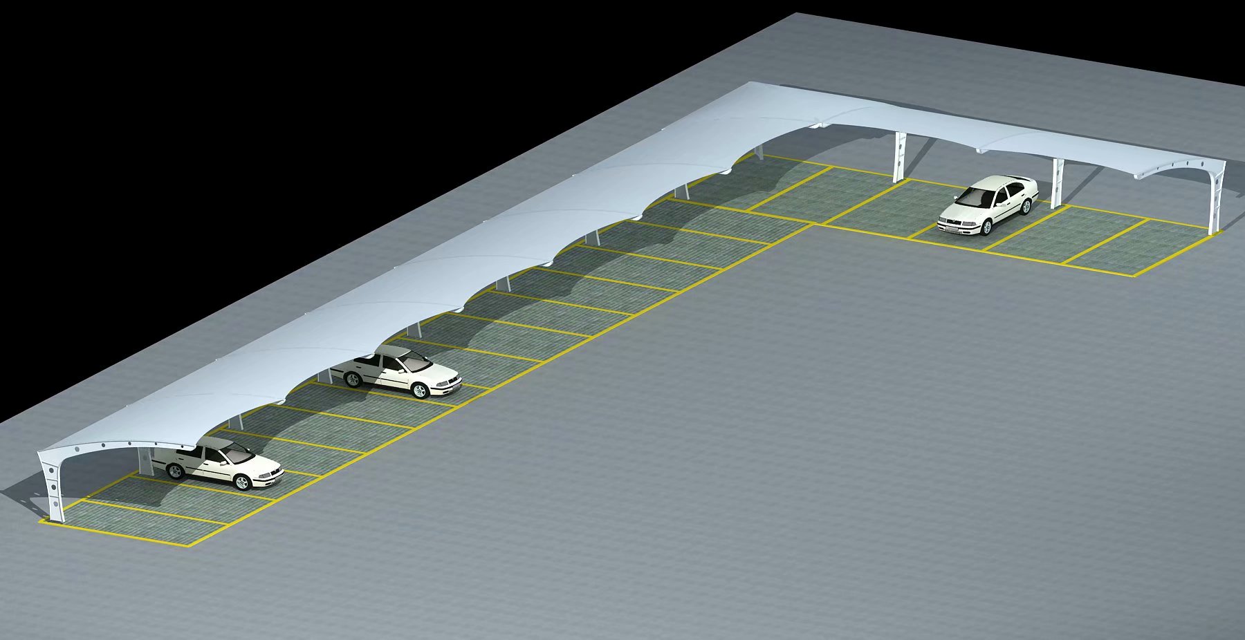 膜结构7字车棚,结构方面一般主体钢结构全部采用异形H钢,是膜结构车棚的一种结构形式。