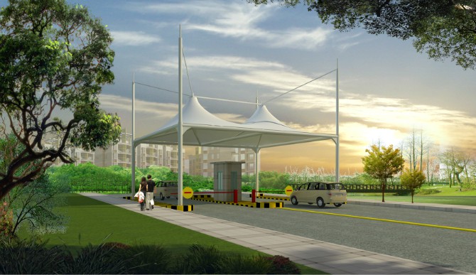 膜结构拉杆车棚是一种结构形式,一般钢结构采用钢管立柱(牛腿),前挑梁采用异形H钢。