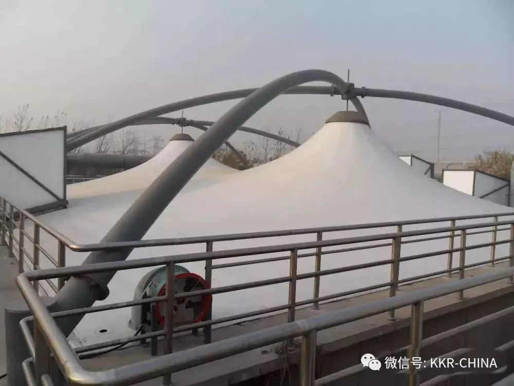 由于工艺上的要求,需要定期对设备进行检查和维护,可以通过在边膜上预留门和通道的方式(膜结构密封垂帘门或塑钢窗)解决在污水处理中,因工程改进或者是流程需求,需要使用盖板将污水池封闭起来。既可以阻止污水池内的污水挥发对周围环境造成污染,又可以供工作人员或机器在盖板表面进行施工。