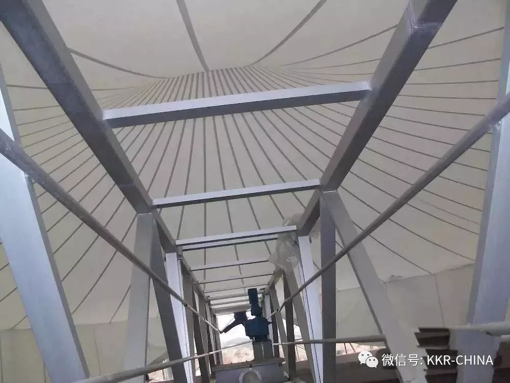 采用抗腐蚀能力很强的节能膜把废气罩住,钢结构在外面将膜悬吊。这样既发挥了节能膜的抗腐蚀性能,又从根本上解决了钢结构与腐蚀性气体接触而带来的腐蚀问题,因而钢结构可以按普通建筑钢结构的防腐等级考虑进行设计,具有50年的使用寿命,发挥了钢结构的性能,实现了结构骨架与覆盖材料的完美结合。使用年限:膜部分15年,钢结构部分50年。